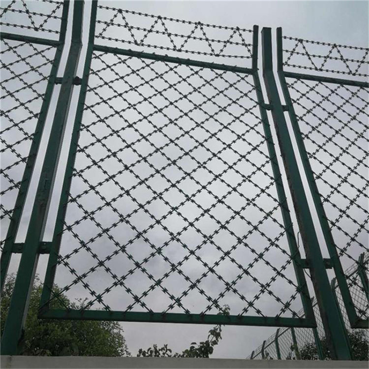 5. 監(jiān)獄鋼網(wǎng)墻頂部防攀爬刀片滾網(wǎng)、拉絲、卡扣,均采用不銹鋼材質(zhì)。刀刺網(wǎng)安裝固定卡扣整體調(diào)正,使刀刺網(wǎng)不出現(xiàn)擰轉(zhuǎn)情況,刀刺刺圈分布均勻,每隔30-40cm與拉絲固定;段連接處需將兩端刀刺網(wǎng)做連接固定,刀刺網(wǎng)固定點(diǎn)需緊鎖不得出現(xiàn)松動(dòng)、脫落現(xiàn)象;刀刺網(wǎng)安裝與隔離網(wǎng)平行,上下左右均成直線延伸,轉(zhuǎn)角處需做加密加固處理。