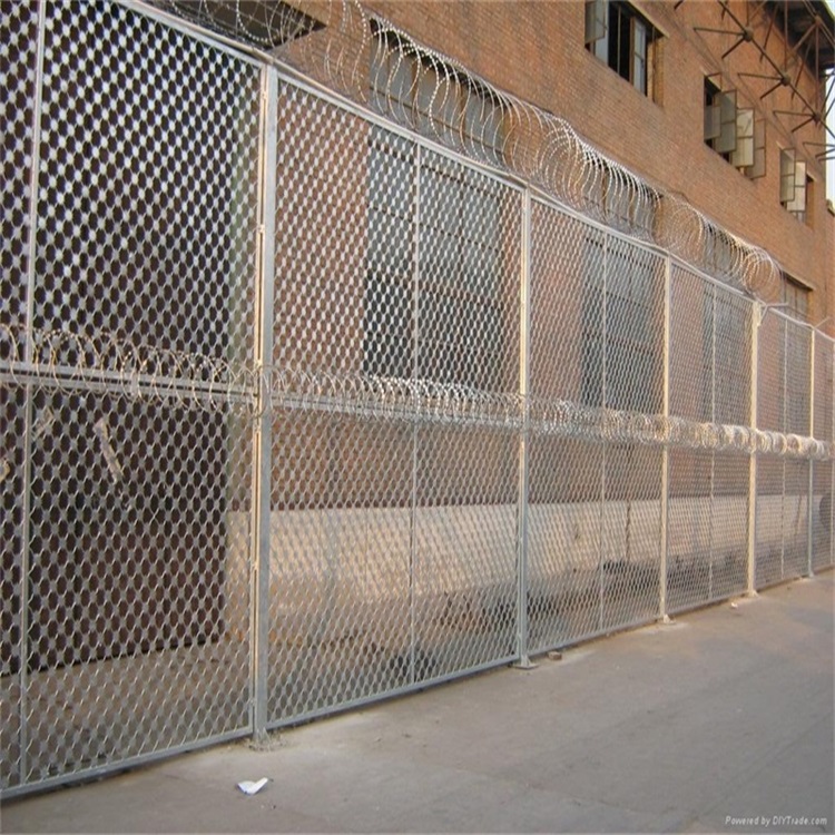監(jiān)獄安防網(wǎng)又稱監(jiān)獄護欄網(wǎng)或監(jiān)獄隔離柵, 它主要是采用高強度的刀片剌網(wǎng)與普通防護網(wǎng)的結合,由V型支架立拄,加強型焊接片網(wǎng),安全防盜連接件和刀片刺網(wǎng)組成。刀片剌網(wǎng)是一種新型防護網(wǎng),由銳利尖角鍍鋅鋼板或不銹鋼薄板做刀片,鋼絲做芯線組合而成的防護器材。
