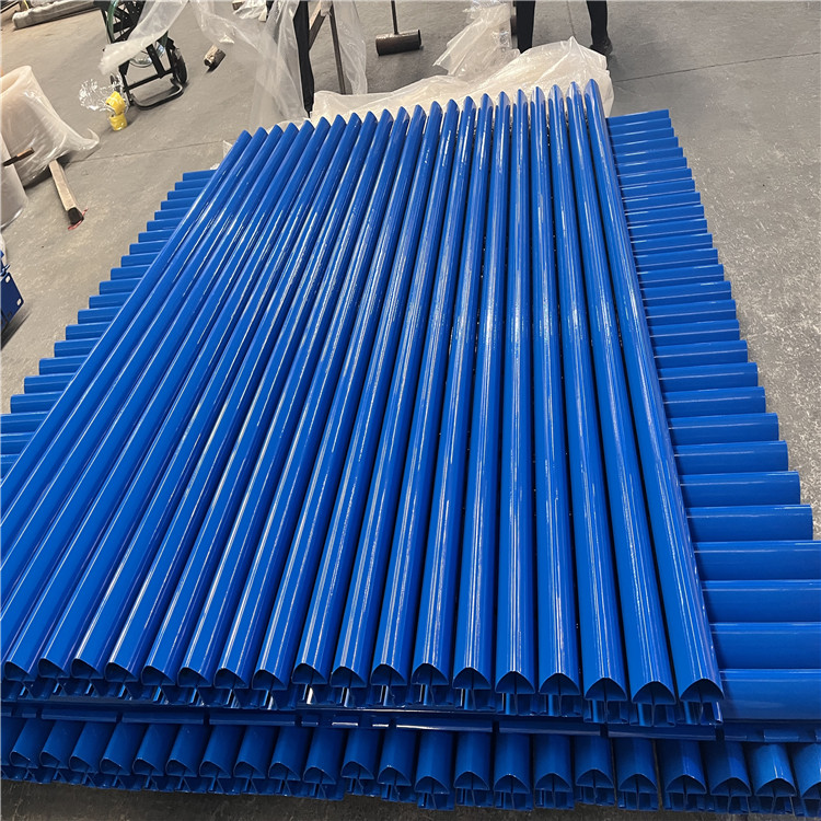 桃型柱護欄立柱的結(jié)構(gòu)描述:一般桃形立柱的板材厚度為1-1.2mm,通過機器冷壓、冷彎成型。柱體外側(cè)為橢圓型,內(nèi)側(cè)兩板相接后均各自向外彎制成U型,即為掛鉤部分。為便于桃型立柱與網(wǎng)片的連接,立柱內(nèi)側(cè)根據(jù)網(wǎng)片的網(wǎng)孔尺寸,延立柱長度方向均勻的設(shè)置N組鉤掛缺口分布于柱體兩側(cè),掛鉤U型的外部與外側(cè)的橢圓形柱體的直邊相切,有效地防止被撬開,保證了護欄的防撬安全性能。