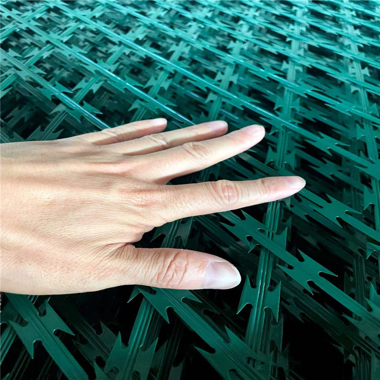 焊接刀刺網(wǎng)是把刀片刺絲焊接成菱形孔或者方形孔的刺網(wǎng),如果有人想攀爬翻越,網(wǎng)狀的刀片刺絲刀片鋒利,手不能握,腳不能攀登,堅(jiān)決阻止人逾越的防護(hù)墻,具有很強(qiáng)的恐嚇和阻止效果,既美觀又實(shí)際效果顯著.