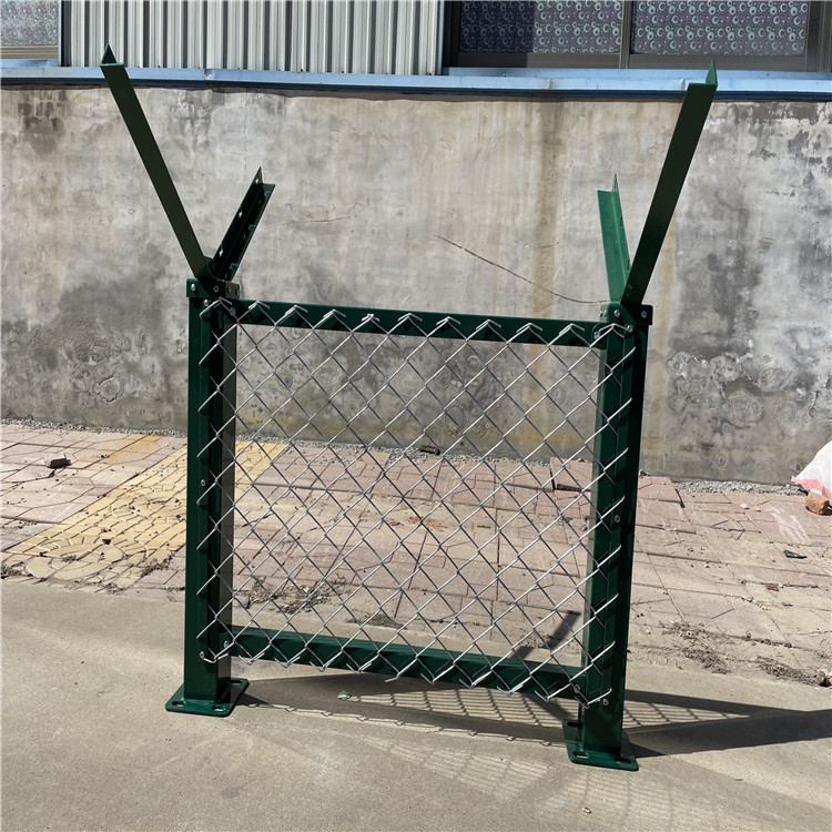 用在機場的鋼絲網圍界的樣子,墨綠色的Y型立柱,搭配50*100mm帶有折彎加強筋的堅固網片,立柱上部加裝蛇腹型的刀片刺繩,刀朋是經特定的機子沖壓成型,特別鋒利,起到很好的震懾阻嚇的效果。