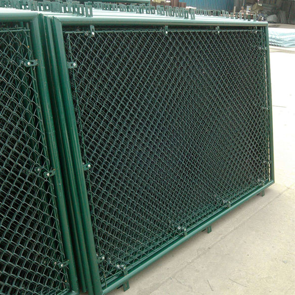 球場圍網(wǎng)由圍網(wǎng)框架+整體式拉網(wǎng)模式,結(jié)構(gòu)簡單耐用,整體效果好,性價比高。圍網(wǎng)的骨架通過直通、三通、四通等專用扣件將立柱和橫梁連成整體呈”口”或”日”字型,用高強(qiáng)度螺栓固定,圍網(wǎng)高度為4000mm,兩立柱間距三米左右;待圍網(wǎng)骨架搭建成型后,現(xiàn)場整體張拉圍網(wǎng),并用扁鐵固定在骨架的立柱及橫梁上。【配備1個1200mm*2000mm的單開式框架門】